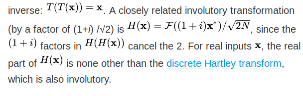 The conjugation trick can also be used to define a new transform, closely related to the DFT, that is involutory—that is, which is its own inverse. In particular T is clearly its ownThe conjugation trick can also be used to define a new transform, closely related to the DFT, that is involutory—that is, which is its own inverse. In particular