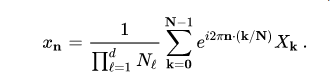 where ω N ℓ = exp ( − i 2 π / N ℓ ) as above and the d output indices run from k ℓ = 0 , 1 , … , N ℓ -1. This is more compactly expressed in vector notation, where we define n = ( n 1 , n 2 , … , n d ) and k = ( k 1 , k 2 , … , k d ) as d-dimensional vectors of indices from 0 to N − 1 , which we define as N − 1 = ( N 1 − 1 , N 2 − 1 , … , N d − 1 )